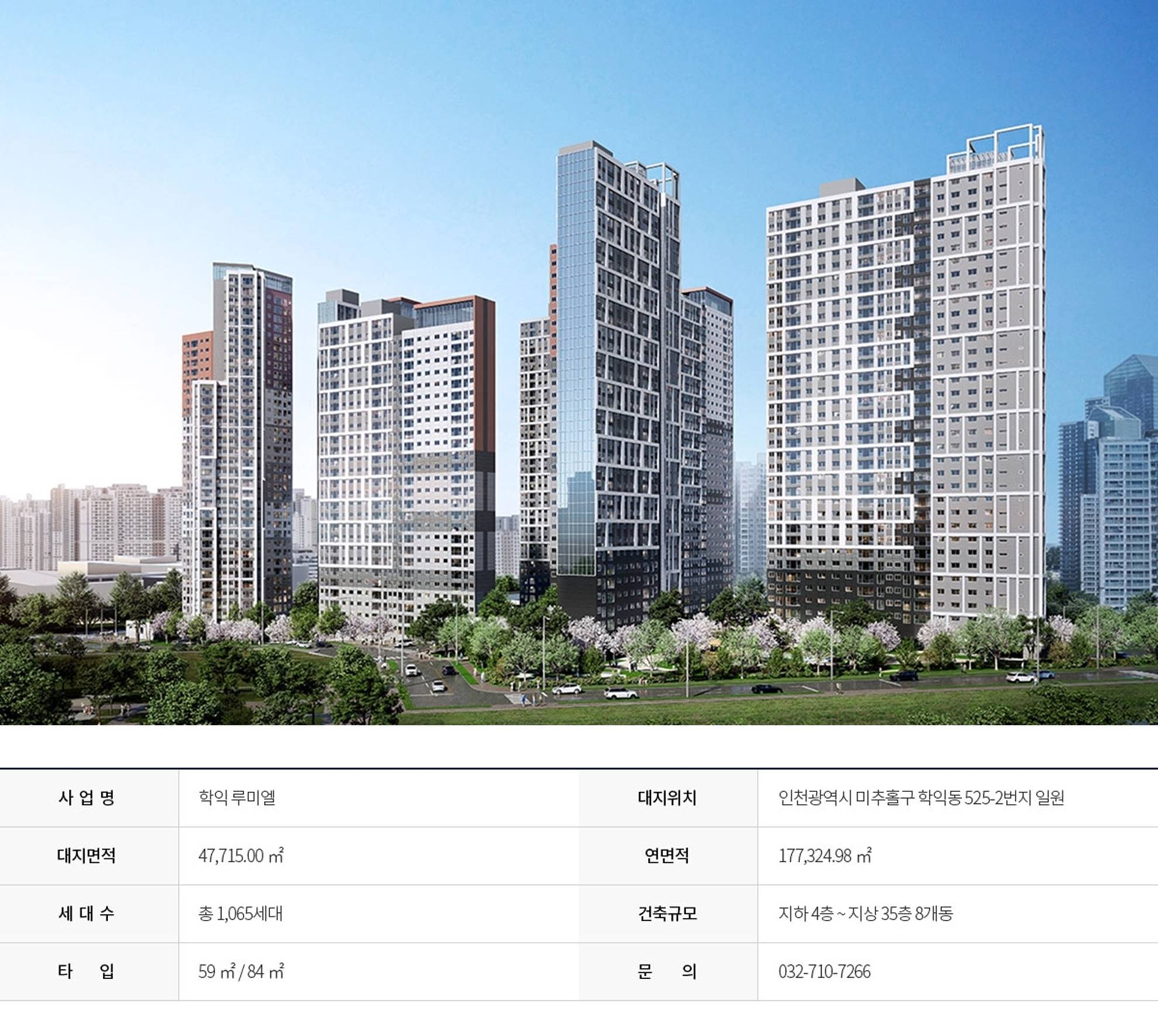 지상 최고 35층, 8개 동, 총 1,065세대 규모로 조성되어 용현학익지구 내에서도 독보적인 존재감을 드러냅니다.
